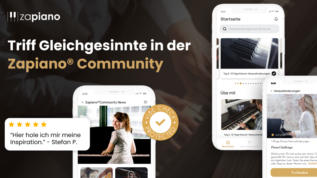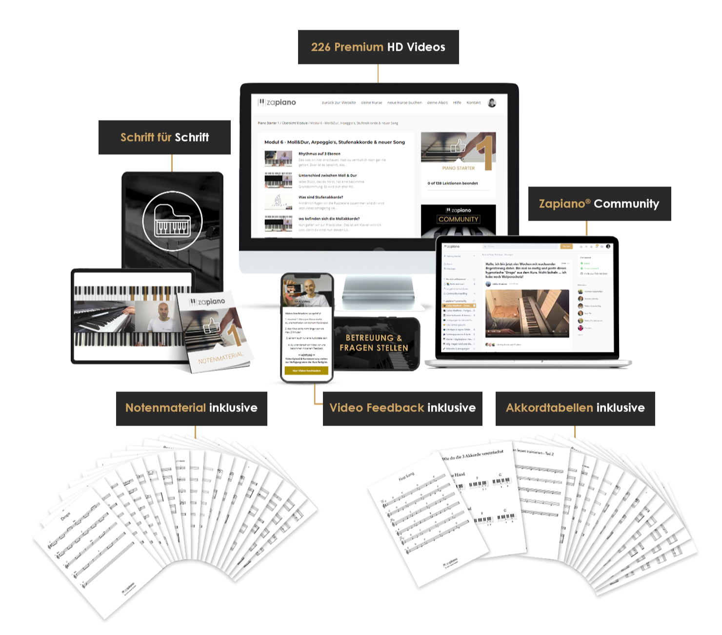 Der Piano Starter 1 ist der größte & verständlichste Klavierkurs für Einsteiger im Internet. Natürlich inkl. Zapiano® Community und Betreuung durch die Zapiano® Coaches.